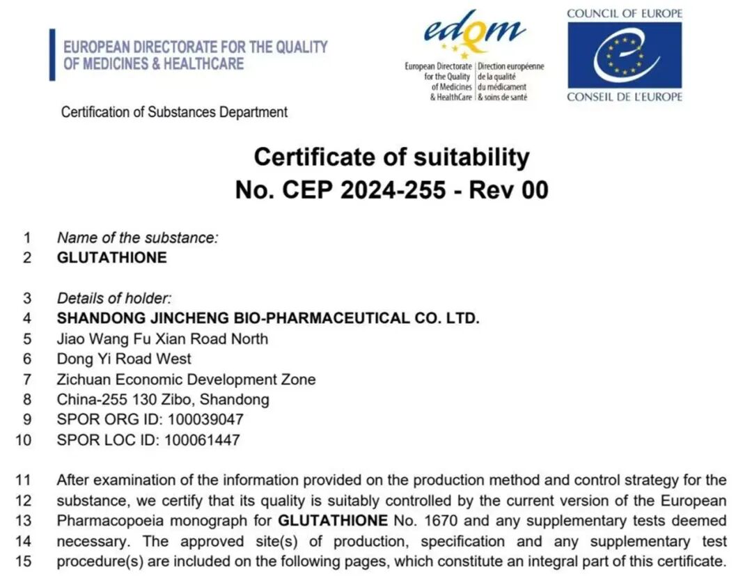 金城生物谷胱甘肽原料药获欧洲CEP认证