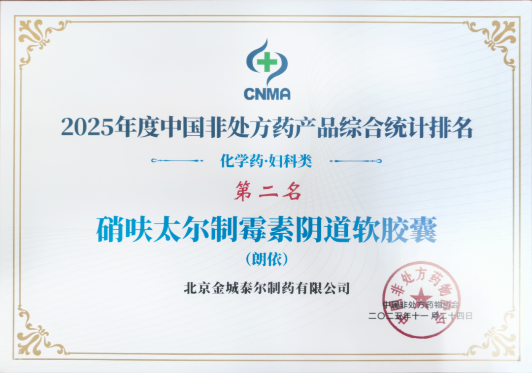 ? ? ??日前,在北京召开的2025年度中国OTC品牌大会上,中国非处方药物协会发布2025年度中国非处方药企业及产品品牌统计调研结果,金城医药集团旗下子公司北京金城泰尔制药有限公司核心产品朗依?硝呋太尔制霉素阴道软胶囊凭借广泛的市场认可度与品牌影响力,荣获中国非处方药产品综合统计排名化学药·妇科类第2名。这一权威认证不仅彰显了该产品在妇科非处方用药领域的领先地位,更印证了金城泰尔深耕女性健康科技领域的深厚积淀与硬核实力。